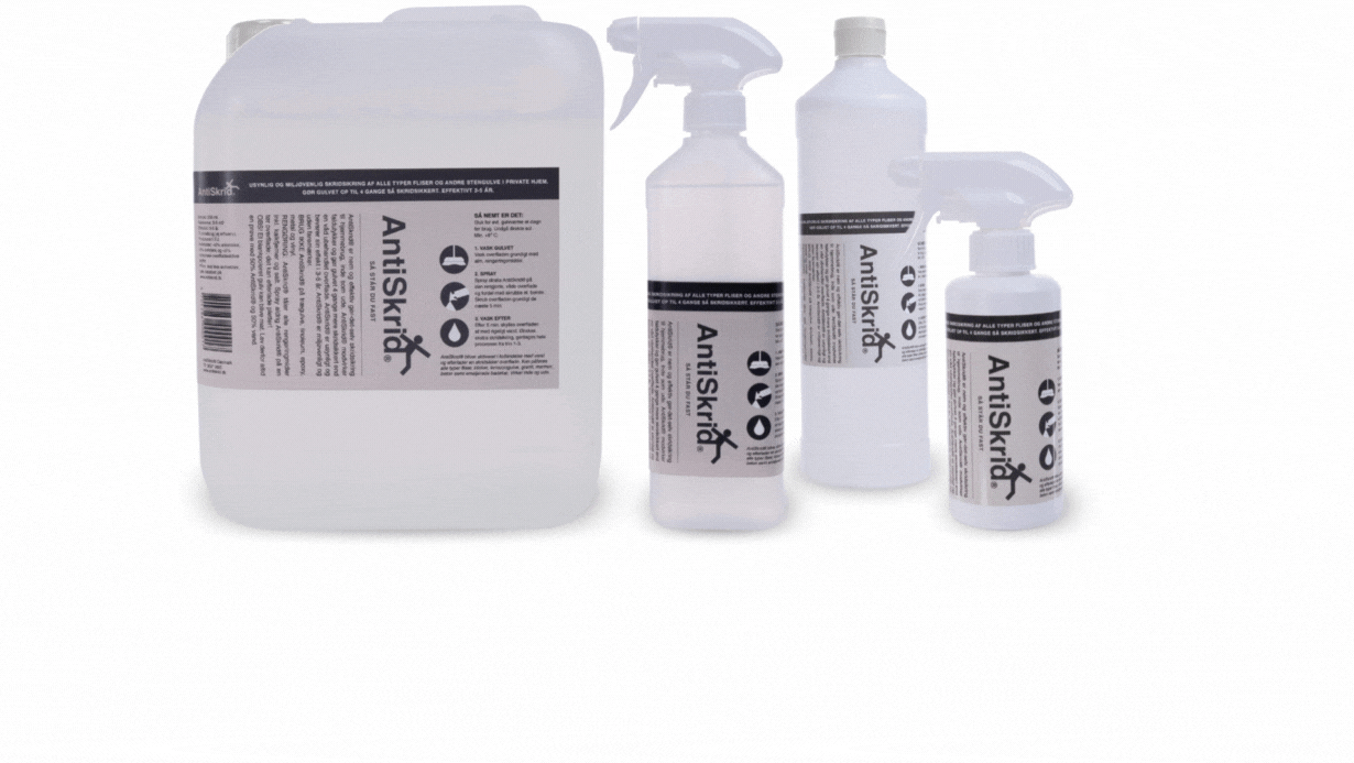 Prøv selv: Bestil vores 250 ml AntiSkrid Gør-det-selv-løsning og test effekten. Vælger I efterfølgende vores professionelle behandling som er endnu bedre, krediterer vi beløbet på Gør-det-selv flasken. Vi tilbyder dette, fordi vi er sikre på, at vi kan hjælpe jer med at skabe et mere sikkert arbejdsmiljø for ansatte såvel som kunder.